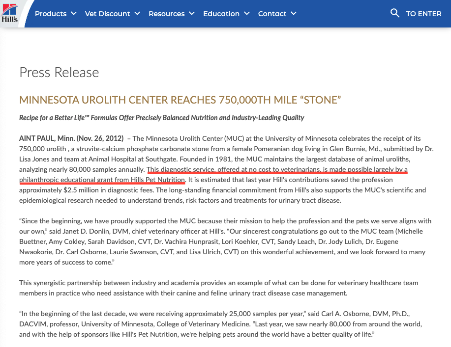 A Hill’s press release dated November 26, 2012 indicates financial support of this group for over a decade. We requested comment from the University of Minnesota and the Minnesota Urolith Center for comment, however neither commented. This is just one of many cases raising questions about industry funding veterinary research, and a pattern of business practices by Hill’s.