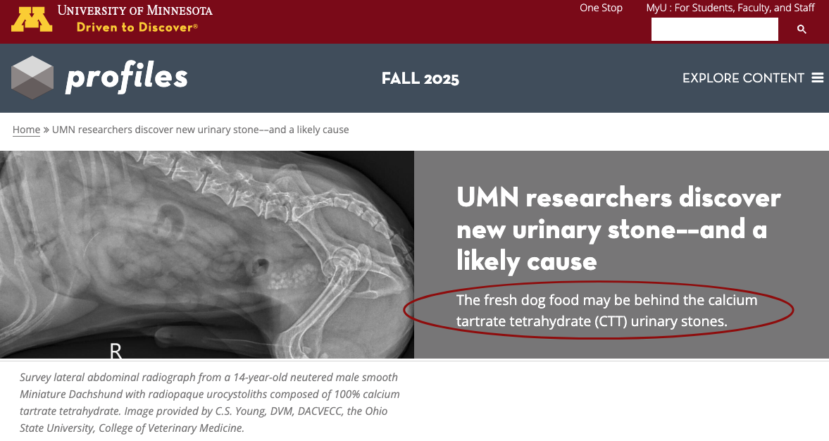 The Minnesota Urolith Center processes more urinary stones than any other veterinarian center in the world. Because of this volume, their recommendations carry significant weight. Unfortunately the claims on their website are misleading.University of Minnesota inaccurately links fresh dog food to rare urinary tract stones