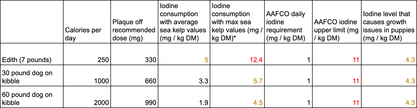 The table above normalizes all figures to mg of iodine per kg of dry food for easy comparison. However, it’s not a direct comparison because puppies consume 2-3 times the amount of calories as adult dogs per kg of body weight, so their overall consumption of iodine is higher. Also, other papers suggest that the puppies that had growth impacted were overfed, further increasing iodine intake, so that value is yellow rather than red.
