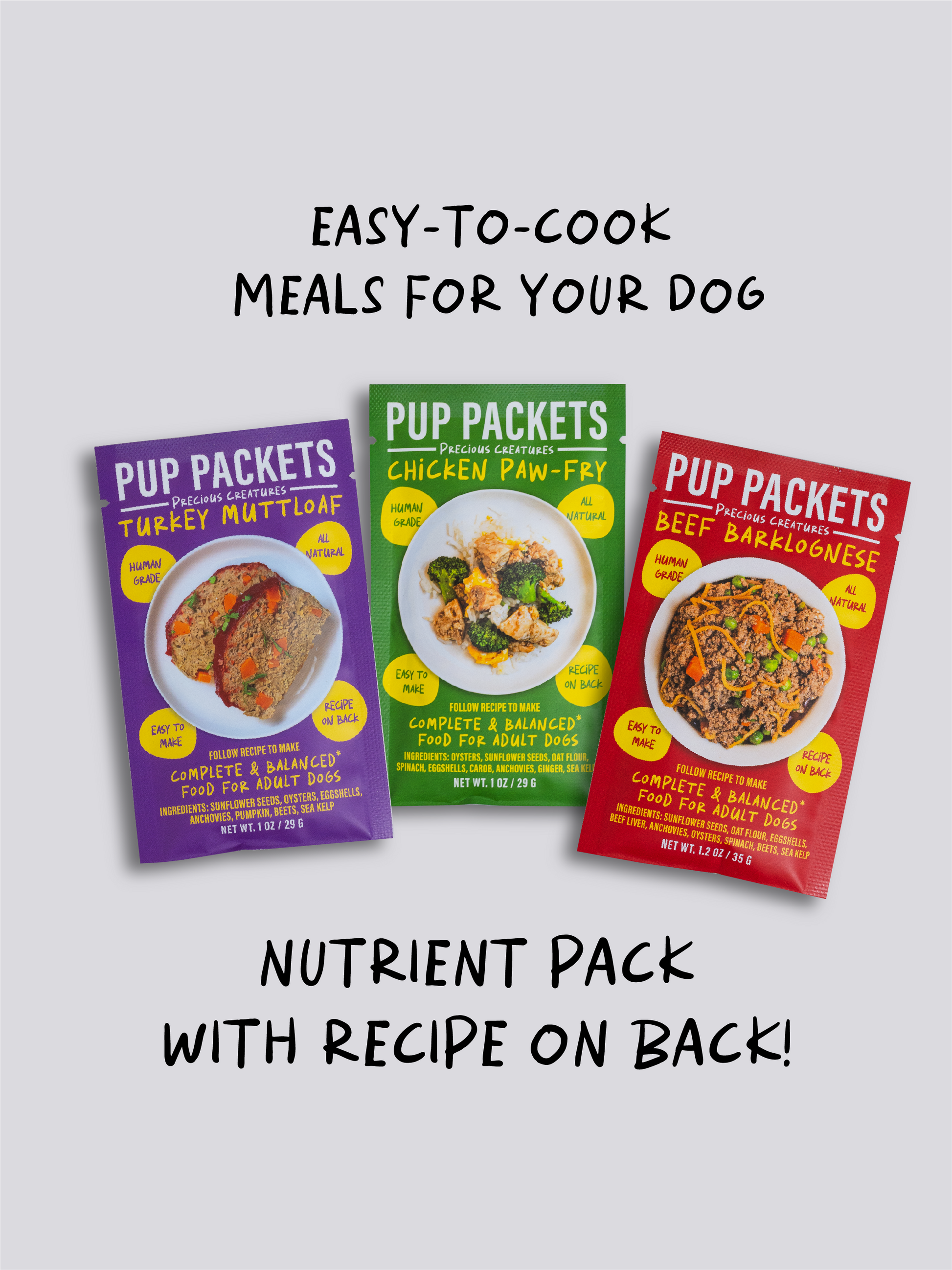 3-pack of our natural nutrient blends for homemade dog food. Follow the recipe on the back to make your dog a delicious meal.