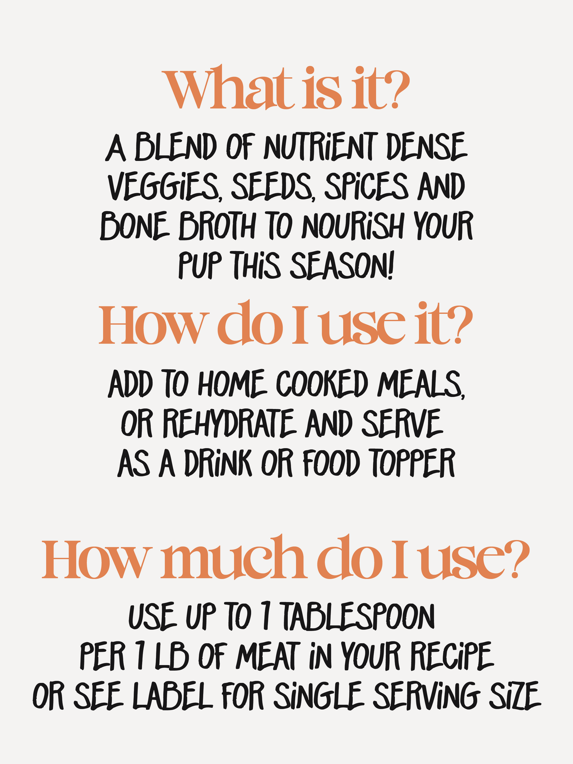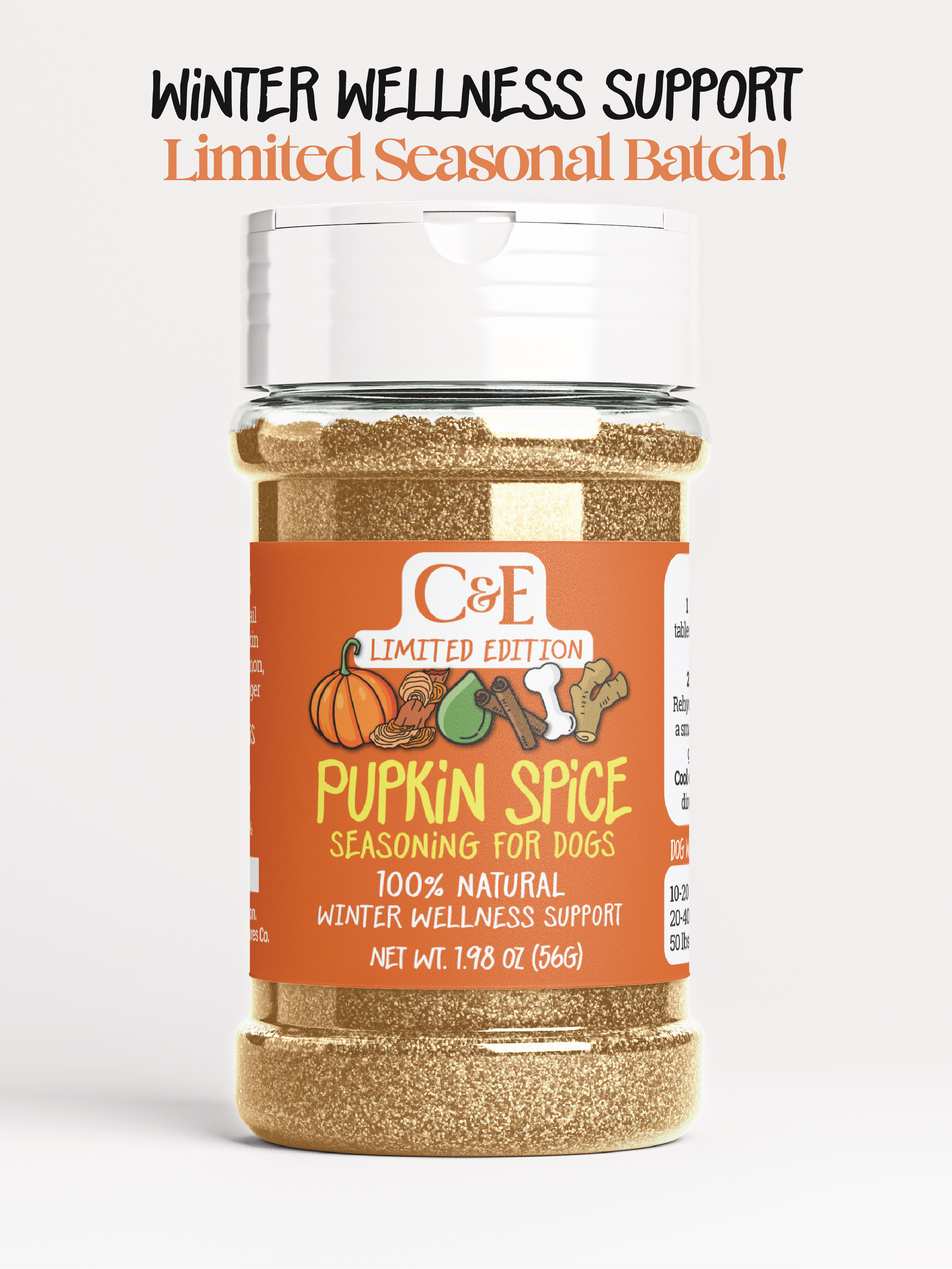 Fall and winter can be tough on our furry friends. Our Pupkin Spice Seasoning is formulated with Turkey Tail mushrooms, Ceylon Cinnamon, Ginger and other immune supporting ingredients to help your pup feel their absolute best. We use only premium ingredients and make our products in a human food factory.
