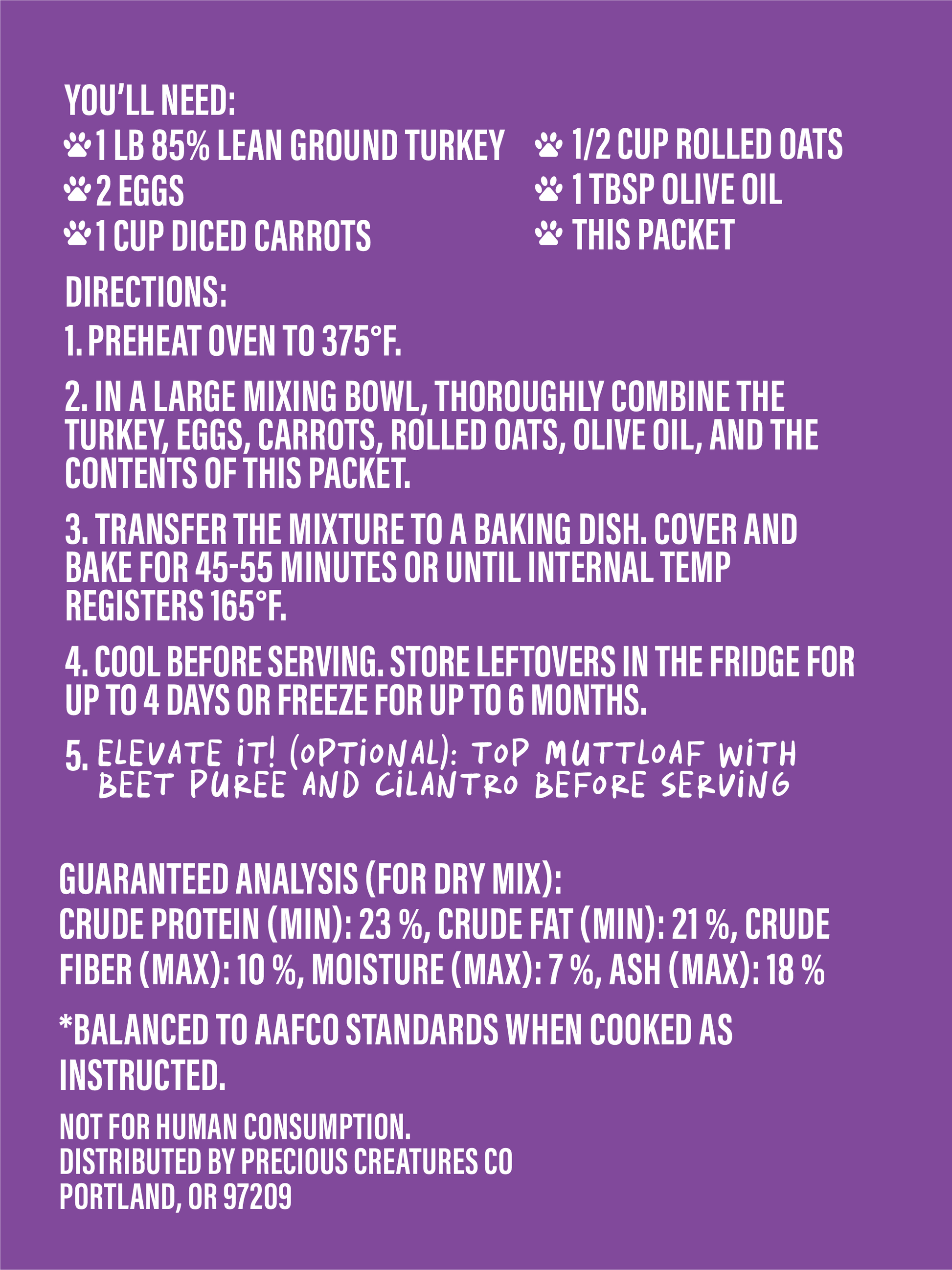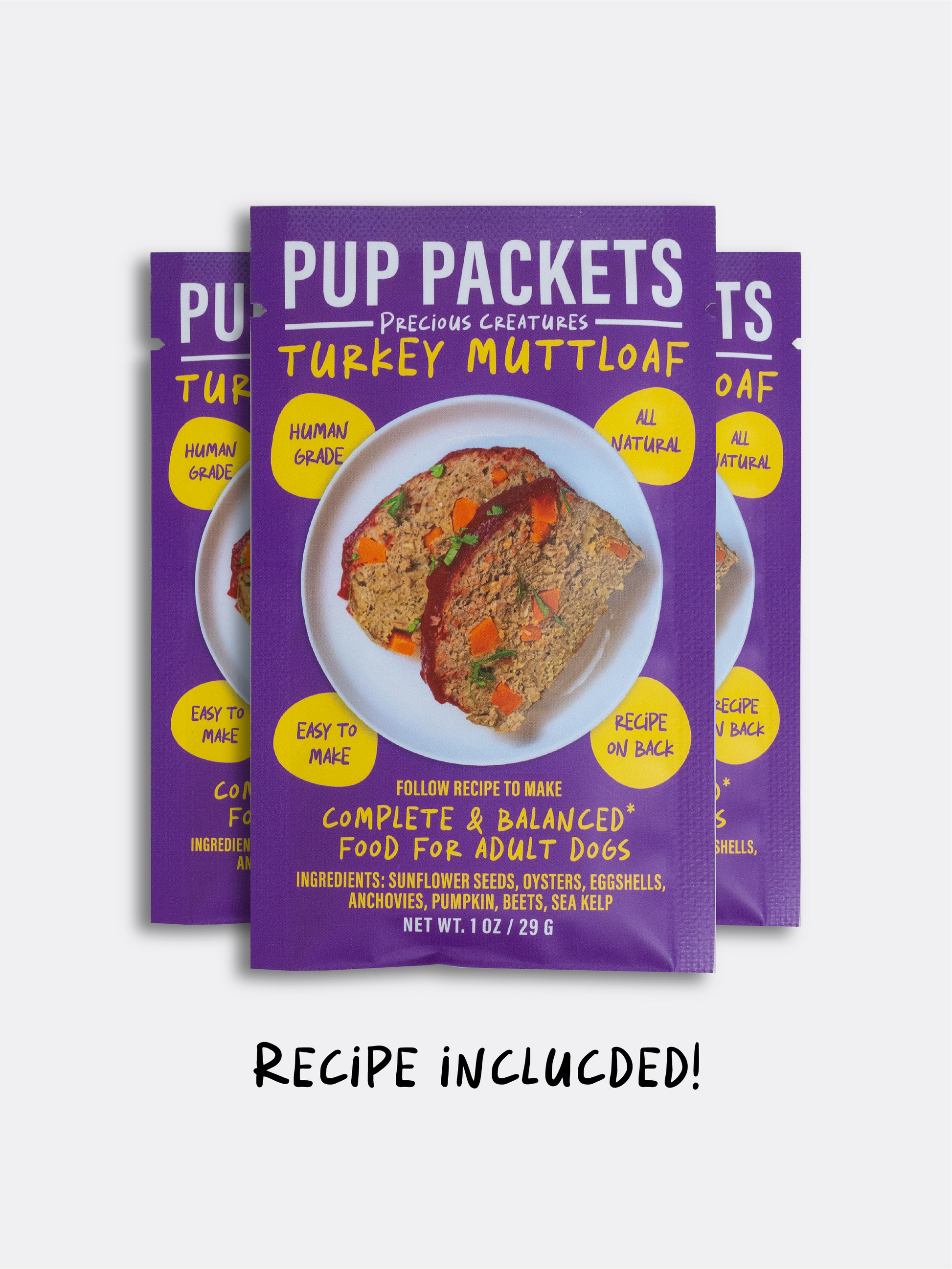 3-pack of Turkey Muttloaf. Our natural nutrient blend for homemade dog food. Follow the recipe on the back to make your dog a delicious meal!